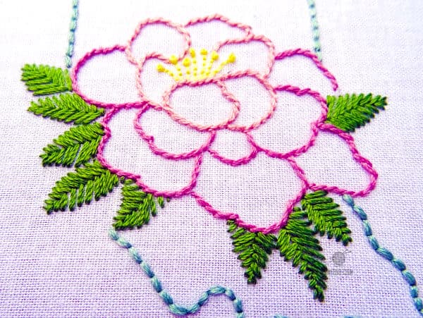 Now let us see how it looks on a real pattern below. Its a simple pattern with flower in the center and then leaves surrounding it. And yes you have guessed it right, all those leaves on the pattern are fishbone stitches perfectly aligned with the flower pattern. One of the specialty of fishbone stitch is that it makes any simple pattern look outstanding with those crisscross stitches back and forth.
