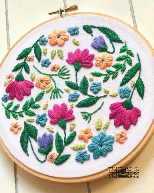 Woven sheen stitch! Under, over, under, over. I end these using a stem stitch around! Hoop stand ,chalk pencil and I’m using all 6 strands here. Stitching on kona cotton fabric and using a size 5 needle!